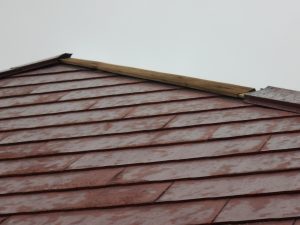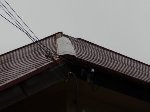 今月の台風で屋根の棟包み(板金部分)が飛んだとのお電話を頂戴し、即日お伺いし確認。写真のとおり風で飛ばされ落ちておりました。