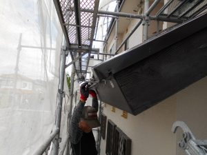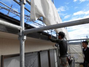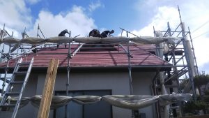 屋根勾配は6寸と急斜面になっておりカラーベーストも滑りやすい状態なので後日に足場を組みすべての棟包みを下地からなおして貼ることになりました。足場を組みますので前から検討されていた外壁と屋根塗装、そして軒樋の取替えのご依頼も一緒にして頂きました。