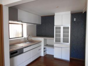 I型キッチンに家電収納ハイカウンターとカップボードで一体感のあるキッチンにしました。