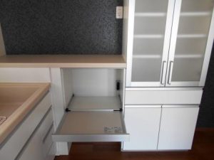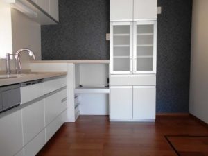 家電収納ハイカウンターの炊飯器収納部はご飯をよそう時に引き出せるようになっています。カウンターの上はレンジを置いて使用できるように専用コンセントを設けています。食器棚を処分しキッチンと一体になったカップボードに食器類を収めるようにしました。カップボード右横は冷蔵庫の設置スペースとなります。大きな冷蔵庫が置けるように有効間口700mmを確保しています。