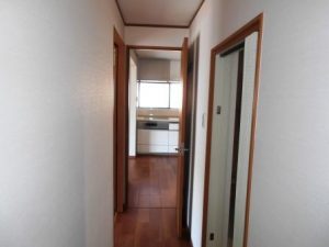 廊下突き当たりのドアを開けてキッチンに入ります。分かりにくいですが左側にはリビングに直接入る引き戸があります。右のアコーディオンカーテンは浴室、脱衣室・トイレへの出入り口です。