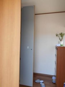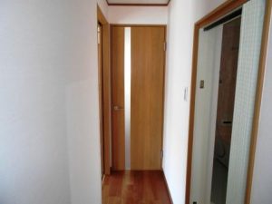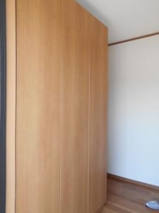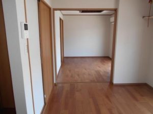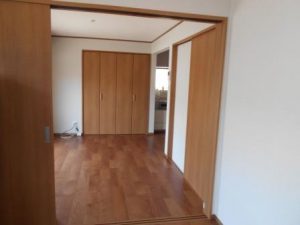 もともとキッチンの隣の居室は和室でしたが間仕切りを出来るだけ取ってフローリングでとおしてLDKとしました。左の写真のキッチン横に押入れだったところをクローゼットにしました。右の写真奥はLDKの隣の洋室です。こちらもフローリングをとおして、引き違いの戸襖から2枚引き戸にして開放感のある居室にしました。