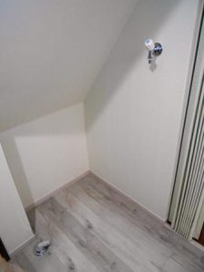 トイレのドアを閉めたところ。ここの空間は触れずドアを開けると洗面化粧台との間はもう、ぎりぎりのセーフです。右の写真は洗濯機置き場。階段の下に収めるようになっています。フローリングはトイレからとおしています。