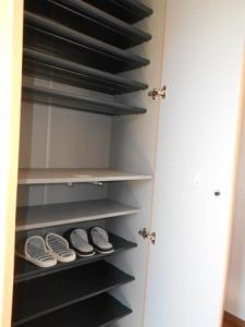 左の写真は廊下側から玄関を見たところ。右の写真が玄関収納コンポリア(簡単に言うと下駄箱です)