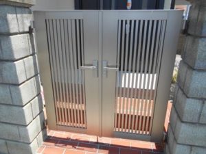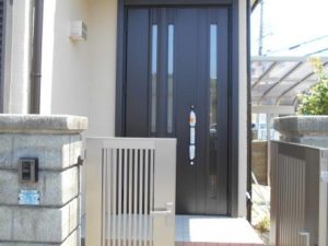 玄関ドアはカバー工法で新しくしました。写真では分かりにくいですがトリノパインという今流行の木目調で断熱仕様です。ポーチのタイルは割れが目立っていましたので張替えさせていただきました。門扉も新しくしていただきました。