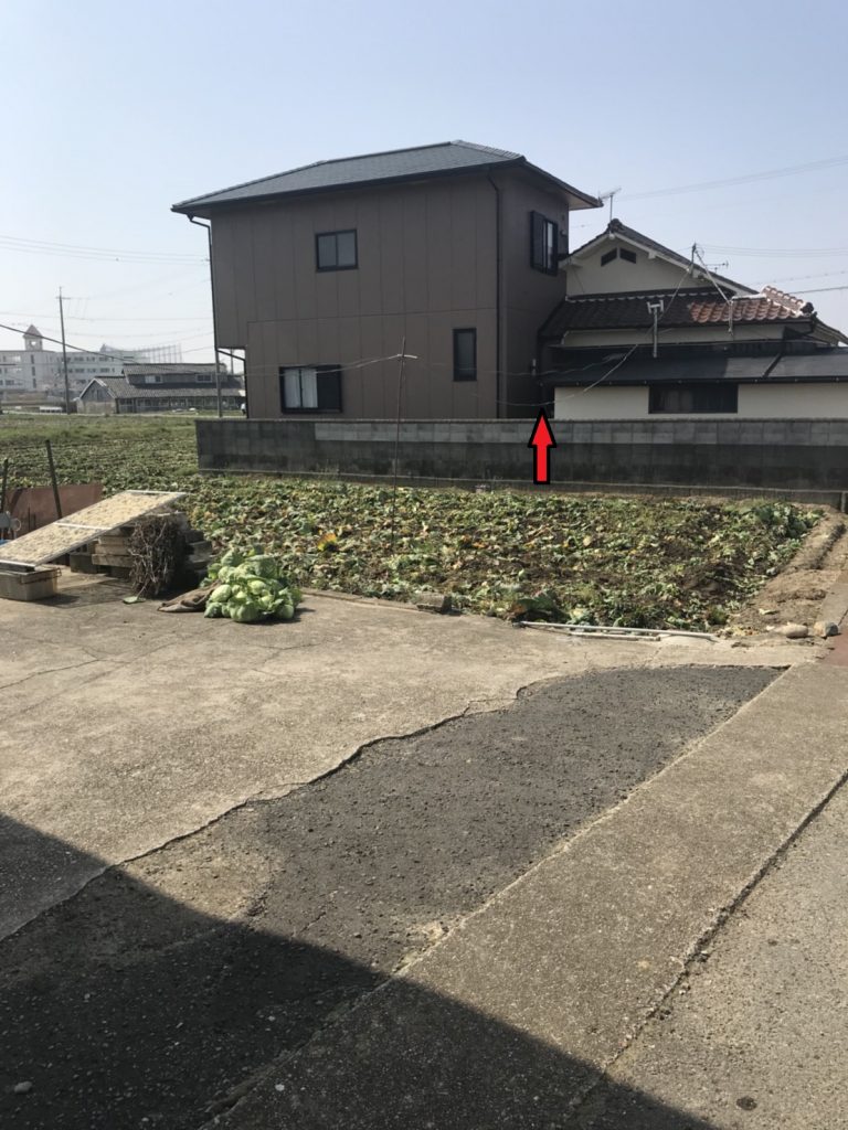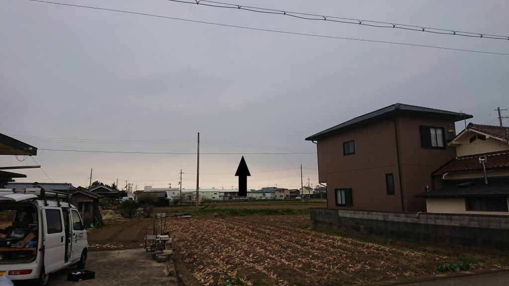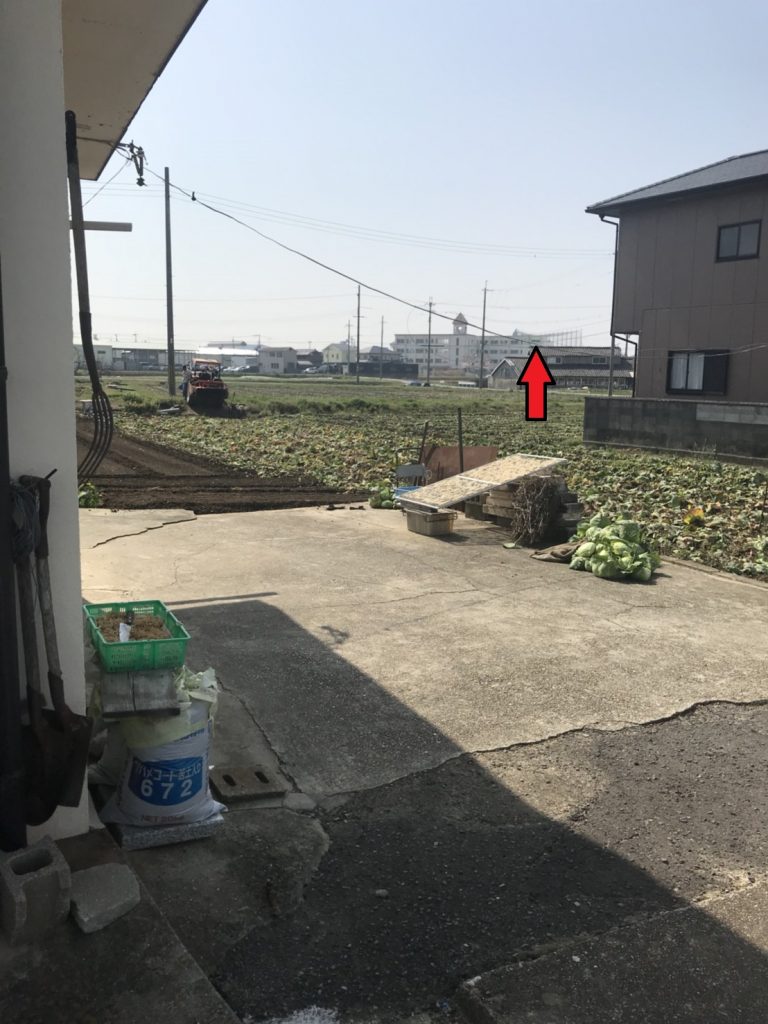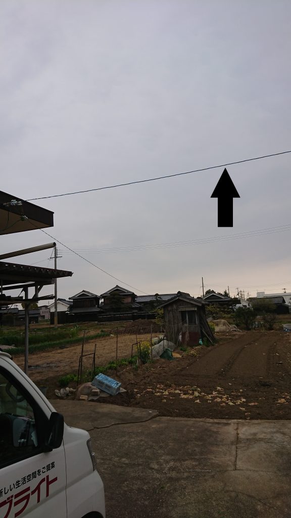見えにくいため、画像を普段より大きく載せています。上記2枚の写真の矢印の電線を取り替える事となりました。既設の電線は、お客様が、2種電気工事士の資格を有されていまして、納屋に電気を送る為、自ら以前に工事されました。ですが、どんどん下に垂れ下がり畑仕事の邪魔にもなり、見栄えも良くないとの事で弊社が依頼を受けました。