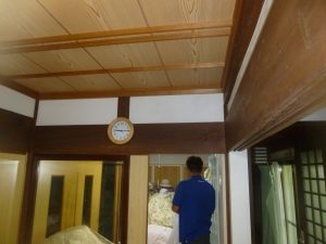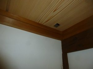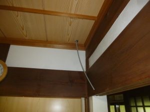 もう一度1枚目の写真を見てください。エアコンを取り付ける部屋の奥には洋室。右手側は縁側に通じる廊下。というわけで外部には通じていません。すぐに廊下側を通して配管をすればよいのですが、廊下に配管を通し勾配をつけるとかなり低い位置に配管が横切る状態となり見た目が悪くなってしまいます。(高いところで抜くことも出来ますが、差し鴨居((写真のように梁のような鴨居))になっており構造体になりますので穴を開けるのは避けます)このような古民家や農家様のお家では縁側や押入れに配管を這わすケースが多いのですが、出来るだけ見た目をかっこよくして仕上げたいものです。