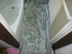 まずは、エアコン専用コンセントを設ける電気工事からですが、その前に部屋を汚さないように養生します。 浴室の点検口を利用して配線を通しますので浴室の脚立を立てる床も毛布で養生を済ませます。