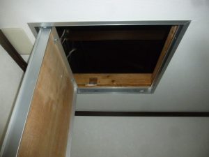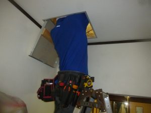 同様に分電盤側からも配線を通して行きフィッシャーで点検口まで引っ張ってもらいます。 そしてお互いの配線を点検口の中(天井裏)で接続をして、分電盤の空きブレーカーに配線をしてエアコン専用コンセント増設工事は完了です。