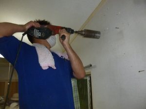 さて、いよいよエアコンの取り付けですが、普通1台のエアコンの取り付けではスリーブ(配管貫通穴)は、1箇所ですが、今回の工事では なんと3箇所のスリーブを設けます。