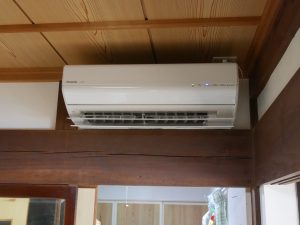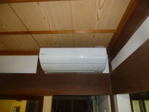 今回は、古民家を数年前に大手某社でリフォームをされたお客様宅への新設工事となります。リフォームそのものは、3室+廊下などを間仕切りを取り除きLDKに改装されたのですが、エアコンが、もともとの1室に10畳用のものが1台のみでエアコン用のコンセントも設けていませんので、「食卓が非常に暑くて何とかならないか?」とのご相談を受けての工事となりました。
