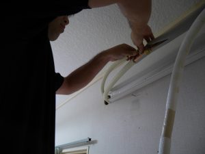 洋室側で配管をつなぎます。配管を綺麗にするため化粧カバーも施工します。