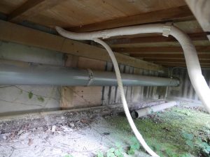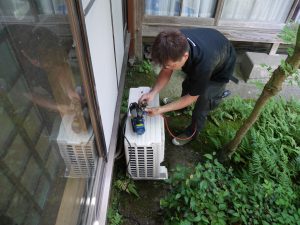 縁の下の配管を済ませ、室外機と配管接続をして、最後に真空引きをして工事は完了です。