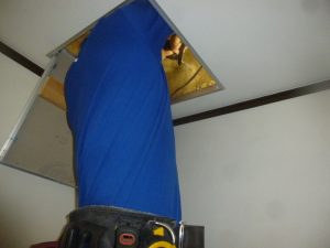 同様に分電盤側からも配線を通して行きフィッシャーで点検口まで引っ張ってもらいます。 そしてお互いの配線を点検口の中(天井裏)で接続をして、分電盤の空きブレーカーに配線をしてエアコン専用コンセント増設工事は完了です。