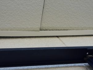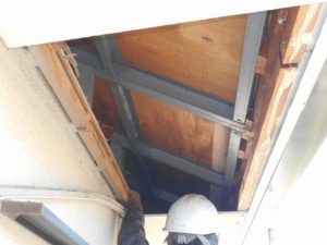とりあえずアップスライダーを用いて上がり、モールを戻そうとしましたが、軒天が下がっているため元に戻すことはできませんでした。右の写真は遠目から撮影。軒天が垂れているのがよくわかります。