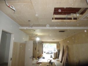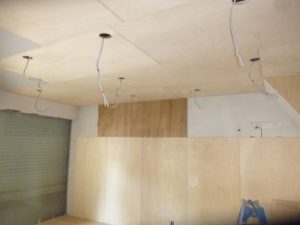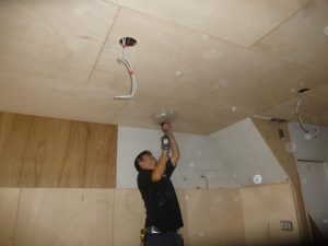 今回の店舗改装の照明はすべてダウンライトです。メーカーで平面図のデーターから照度計算と配置図を作成してもらい、ほぼその内容での工事をしております。ダウンライトの灯数は37台。天井の捨て貼り(既存の天井の下にもう一枚ベニヤを貼る作業)をする前に既存の天井に穴を開けながら配線をダウンライトの取り付け位置付近に配線していきます。上の写真は捨て貼りを終えたところをダウンライトカッターという専用工具で穴を開けていき、配線を取り出しているところです。きっちりと墨出しをレーザーをあてて穴あけ位置に記しを付けてから穴を開けていますので配線は真上にちゃんとあります。ダウンライトを数多く付ける時に大切なのが並びのラインでして、まっすぐ直線にするところはしっかり墨付けをしないでやるとラインが揃わず見た目の問題が起きますので墨付けが重要になります。