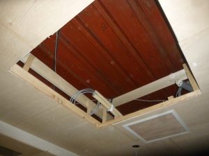穴あけ位置は、図面に記入して、天井の捨て貼りが終った後にそれに従い穴を開けます。このとき天井を貼る前に採った寸法が間違っていると手間な事になりますので、図面にしっかりと壁から何センチ、器具と器具の間隔は何センチとしっかり記入しておきます。上の写真のように37箇所位置を間違えることなく穴あけできました
