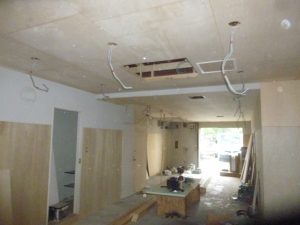 そして、もうひとつのお仕事。空調機器の工事です。今回は天井カセット式のパッケージエアコン。店舗は奥行きがありますので、本当は同時ツインの室内機を2台取り付けられるほうが良いとご提案しましたが、施主様からの支給品シングルタイプを取り付けします。大工さんに天井開口をお願いして、配管や渡り配線、ドレン管の仕込みまでを済ましております。メンテナンス用の点検口も取り付けてもらいました。