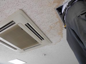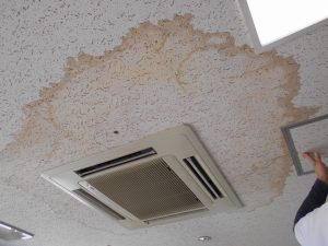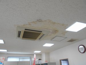 天井ビルトインエアコン2台からの水漏れです。頻繁には使用していなかったので、弊社が他の要件で伺ったときに相談を受けました。 この夏使用中にボトボトといきなり水が天井から落ちてきたとの事でした。