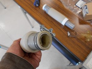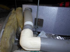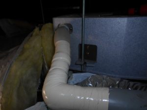新しい繋ぎ口を取り付けしドレン管をホースバンドでしっかり留めてその先は既設のVPドレン管とエルボを接着剤で留めて断熱材で保護しテープを巻いて完了いたしました。