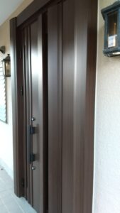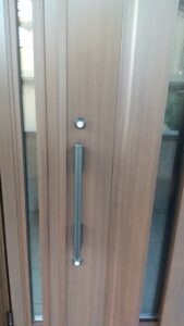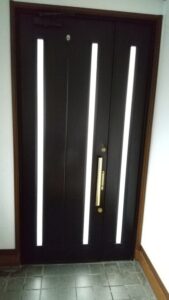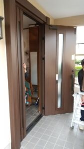 ドアクローザーの調整を終えて工事は完了しました。ちなみに木製の様ですが実はアルミ製です。中央の写真の親ドアの明り取り部分には網戸が装着されており、明り取り部分が内側に開閉し、通風するようになっています。夏場の風通しや、コロナ禍での換気にもお役に立てるようになっています。午前9時から開始し午後4時には工事は完了。1日でこんな立派なドアに交換が出来ます。T様ありがとうございました。