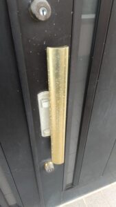築30年で、シリンダー錠の調子が悪くキーが回りにくくなりシリンダー上下とキーの取替と、錆や傷が気にされておりドアの取替との2通りの見積もりをご提示し、塗装工事も数年前にされたばかりでドアだけが古く目立つということもあり、最終的にドアの取替をご依頼いただきました。把手やシリンダー錠あたりには結構な錆が発生しています。