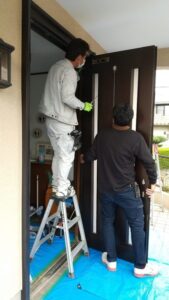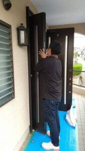 スタッフ1号です。11月に入って少しずつ寒くなってまいりました。街を走っていても木々の色づきがはっきりして綺麗ですね。さて今回は玄関ドアの取替工事の様子をアップ致します。今回取替する商品はYKKドアリモです。換気もできる通風タイプを選択していただきました。