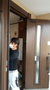 新しいドアの取付です。途中現場を離れている間にすでにドア枠(額縁)の施工も完了し親子ドアの取付もほぼ終わっていました。ドア枠は取替前のドア枠を残した上から被せるカバー工法です。がっちりとしたドア枠になり重厚感があります。枠周りをシールして最後に調整をしていきます。