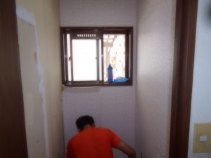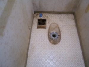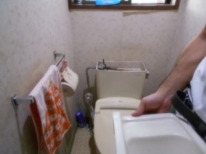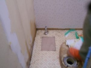 朝8:30~ 既設トイレ撤去です。通常でしたら便器撤去後の9:00に内装屋さんにバトンタッチの予定でした・・・