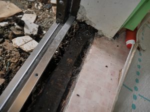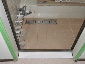 タイルの浴室で脱衣場側の敷居付近を少しめくらせて頂きまして原因となっているところを確認。