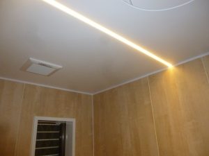 在来浴室のカウンターを解体し浴室をサイズアップしました。床面が広くなったことが確認できます。光色が変更できるパナソニックだけのLEDライン照明とシャンプーやリンスなどの小物が置ける手すり「おきラクてすり」もパナソニックオリジナルです。T様には大変気に入って頂き「リフォムス」に決めていただきました。