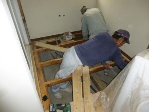 工事の途中でも確認できますが完全に水がまわり土台が痩せてしまっています。柱もシロアリにやられておりましたので最終的には浴室工事のあ と脱衣場側の床も組みなおし防蟻処理も致しました。